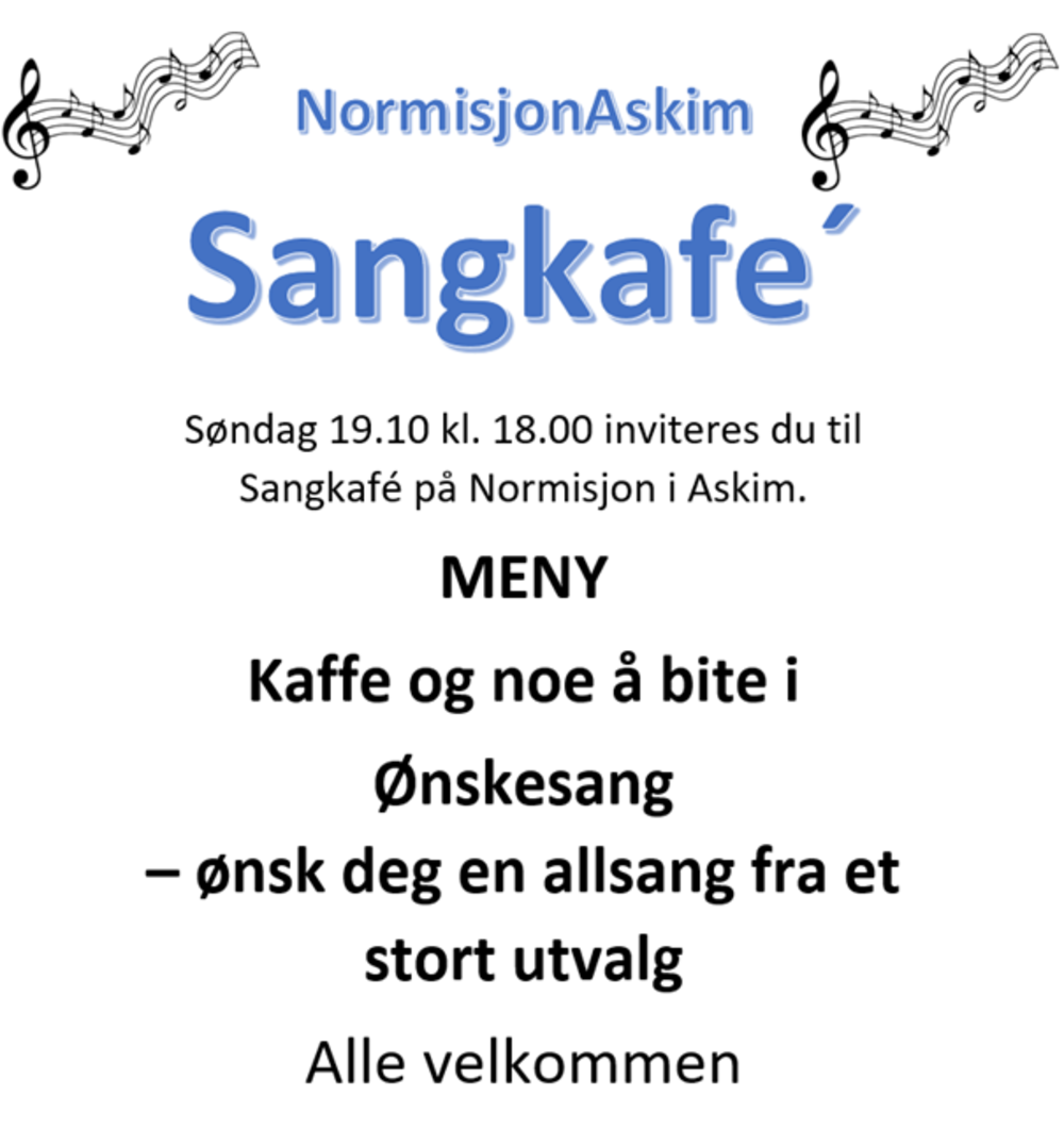 Velkommen til Sangkafé. Du kan selv være med å bestemme hva som skal synges. Velg blant en rikholding meny på over 100 sanger. Det vil bli servering av kaffe og noe å bite i. VELKOMMEN
