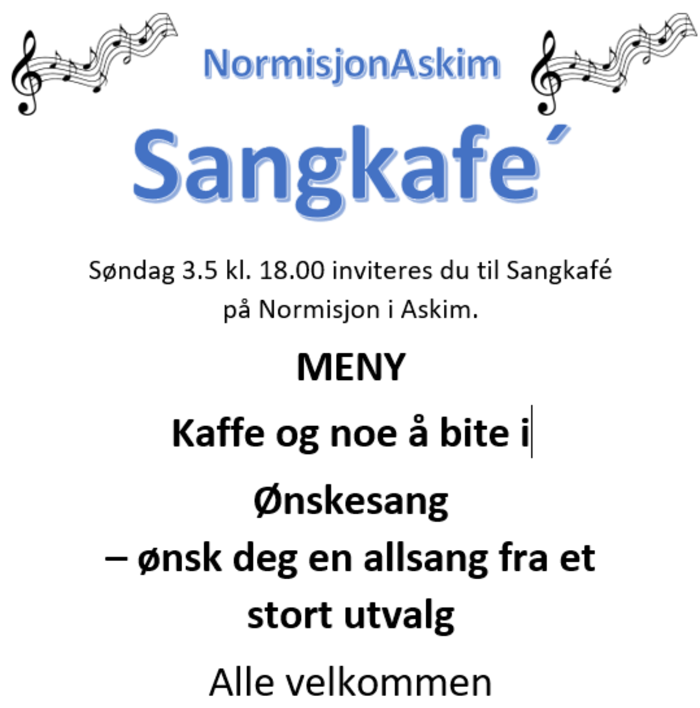 Velkommen til sangkafé. Ta med deg noen og kom. DU kan være med å bestemme hva som skal synges! Vi serverer kaffe og noe å bite i underveis. VELKOMMEN